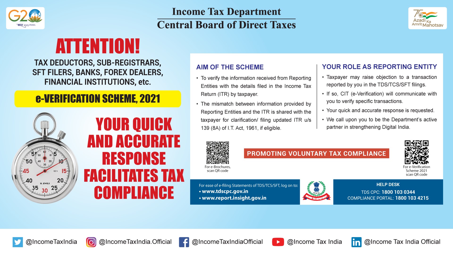 Via tweet on his official twitter handle, the department stated, “Kind Attention Reporting Entities!. Your quick and accurate response to communication on e-Verification, is a step towards facilitating voluntary tax compliance. We call upon you to be Income Tax Department’s active partner in strengthening Digital India.”